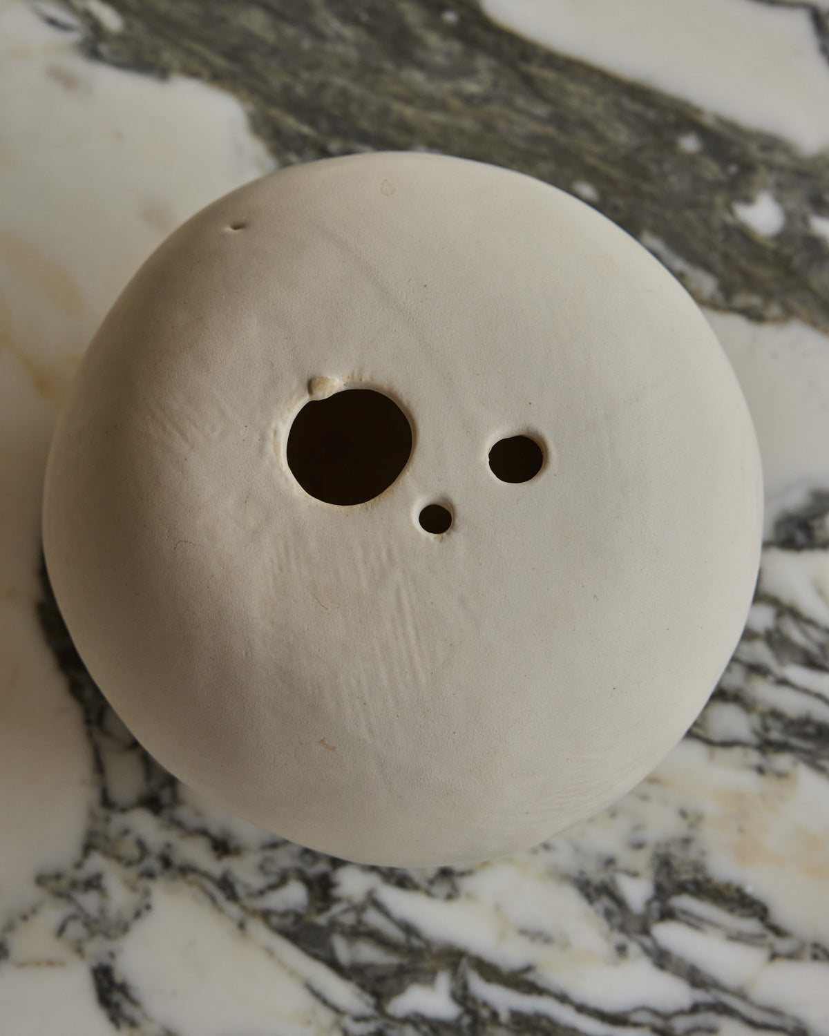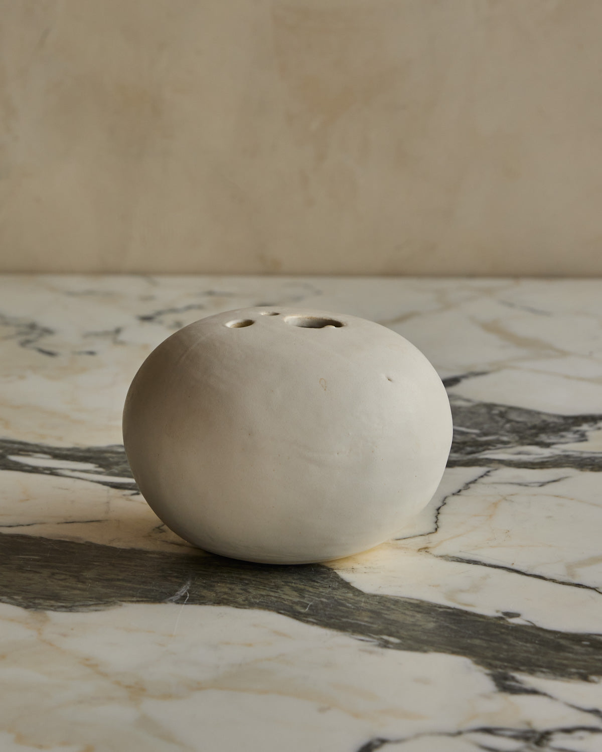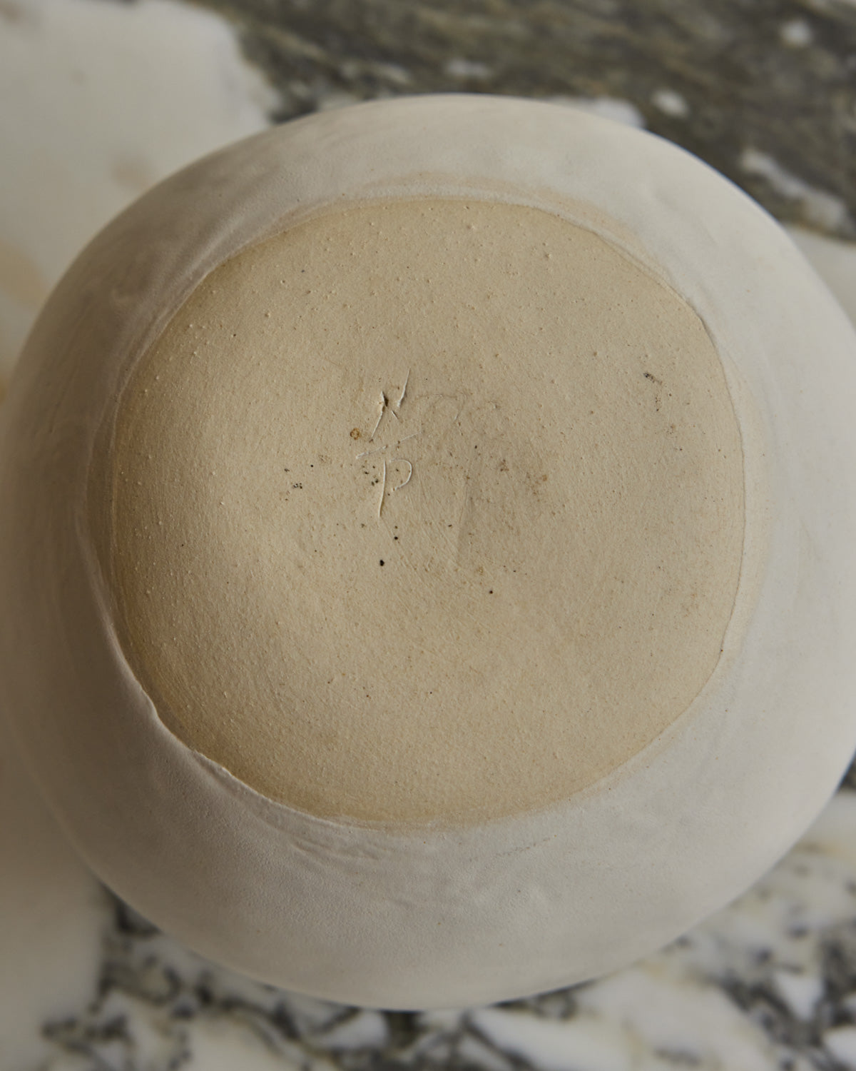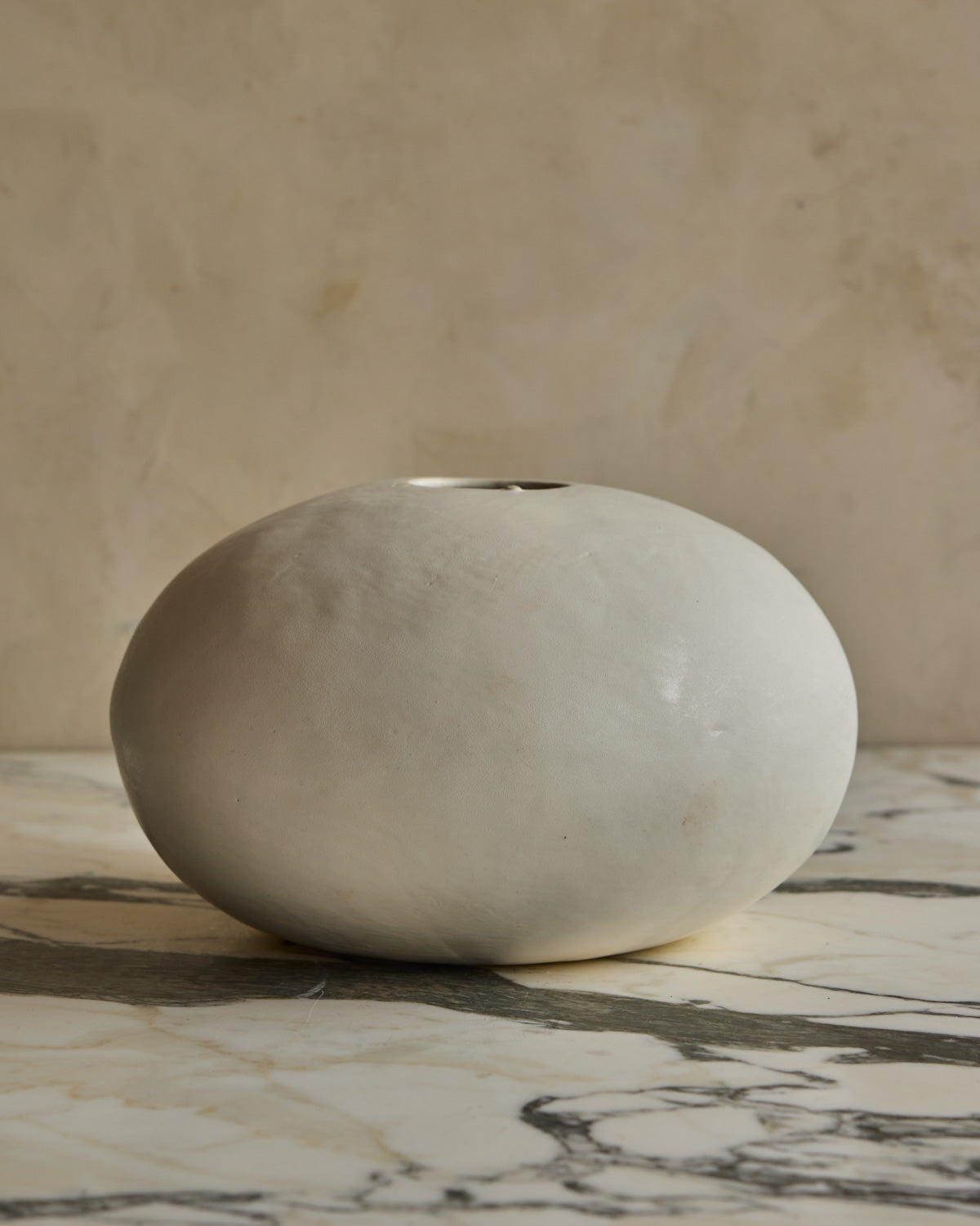 These vessels are part of an ongoing series of rounded forms. They are hand built and blown into to achieve a certain volume. I liken the sizes to parts of the human form. The large and medium are glazed in a satin white glaze and the small is a white gloss.