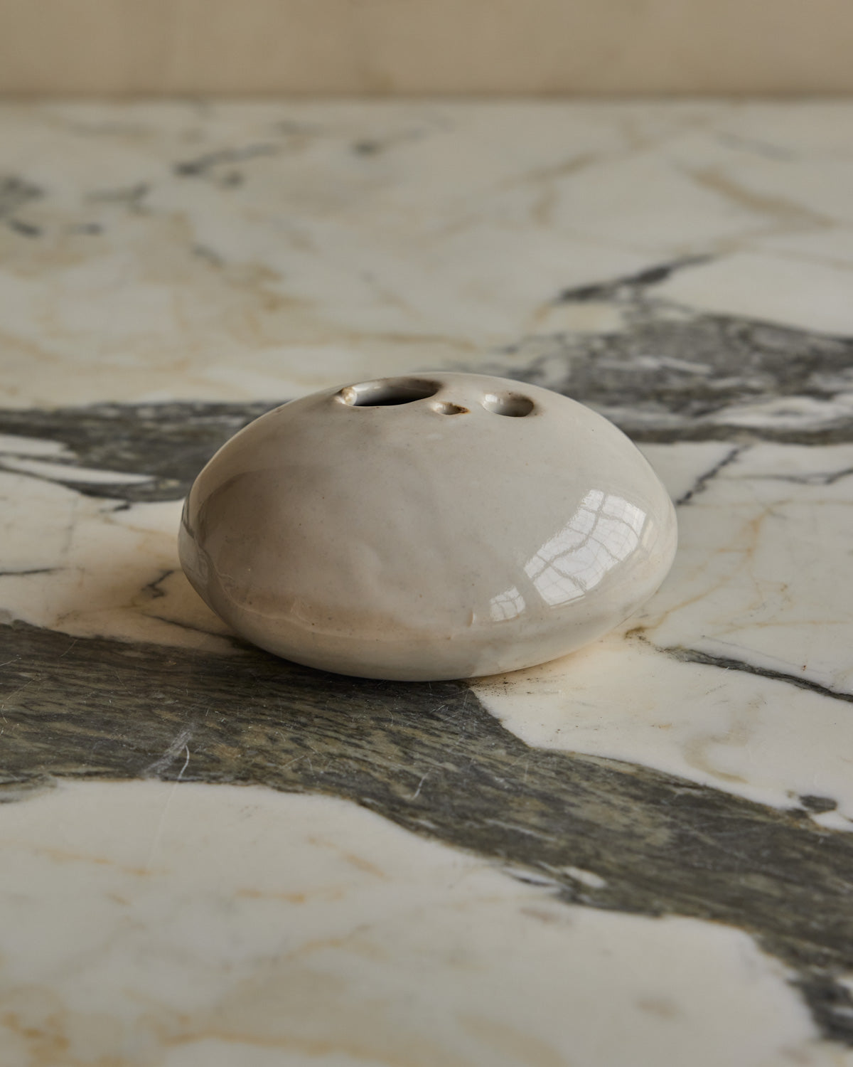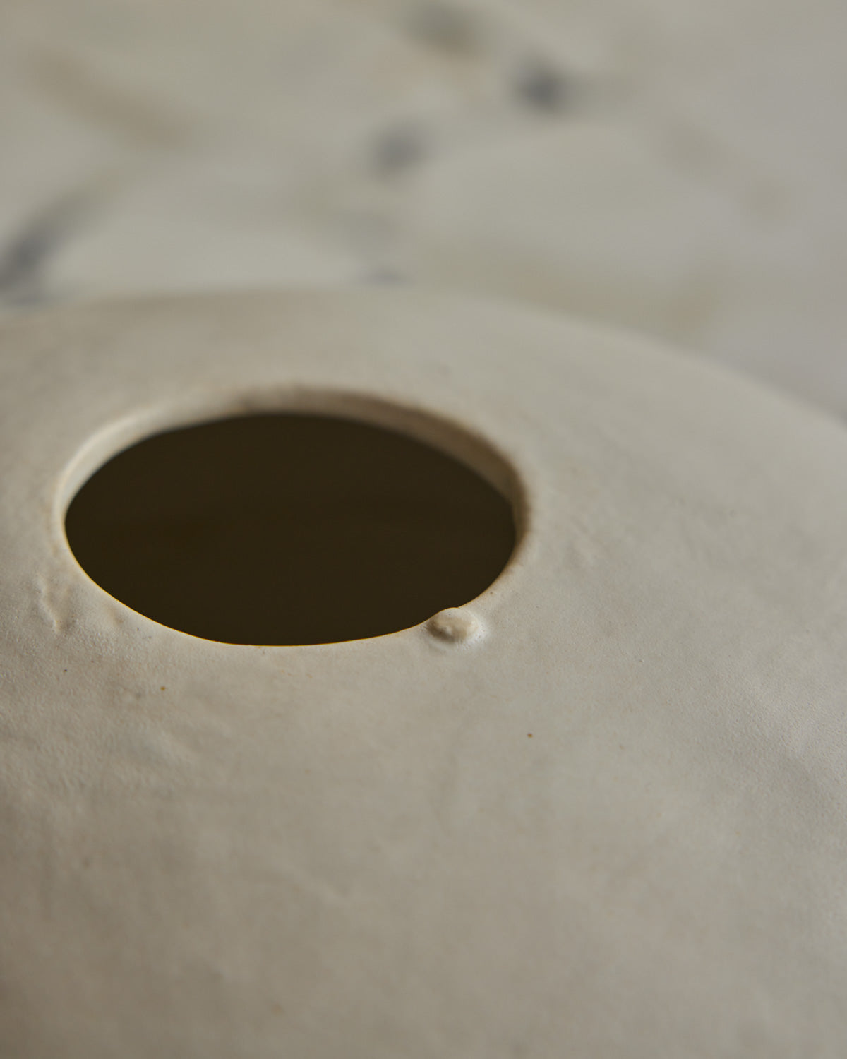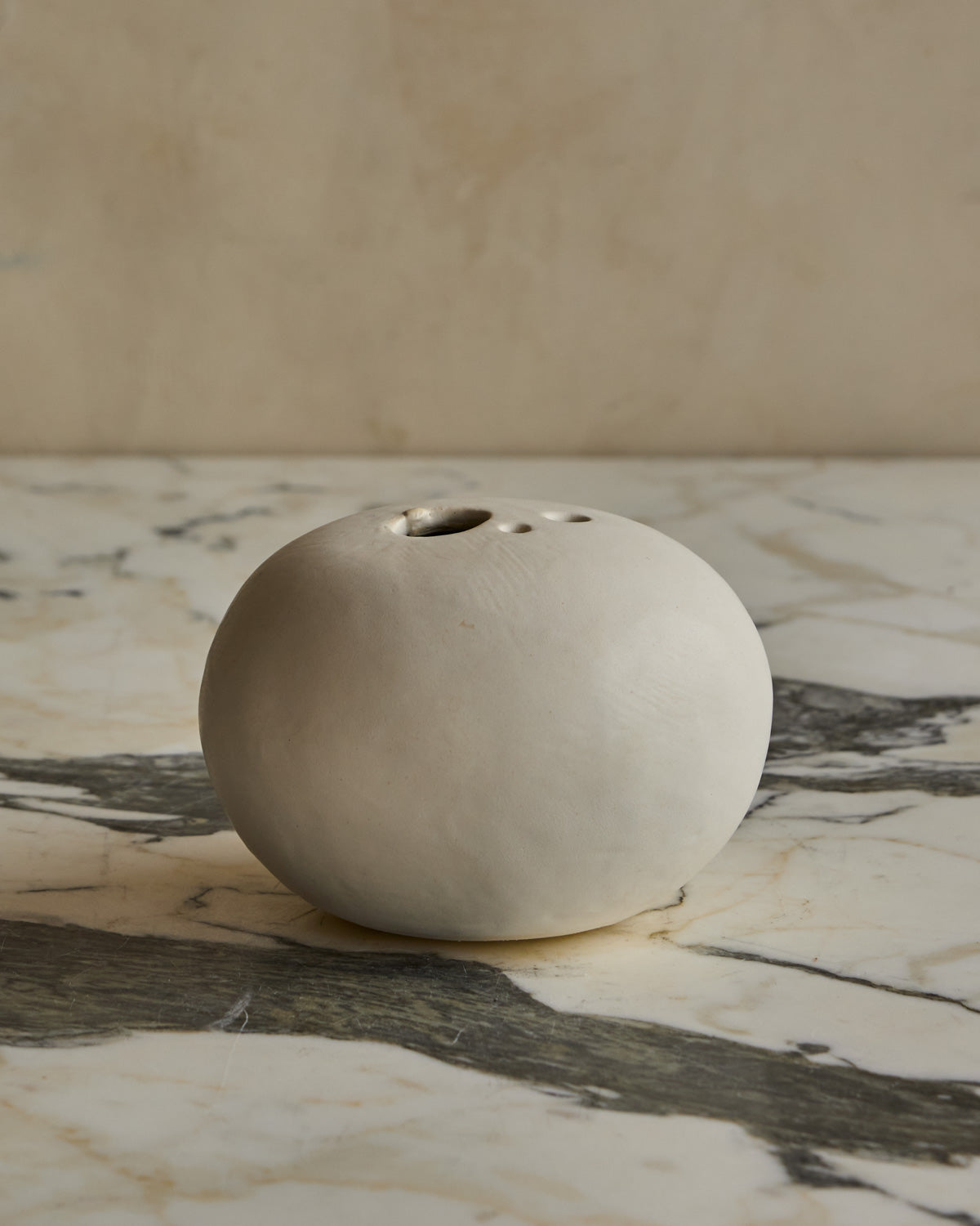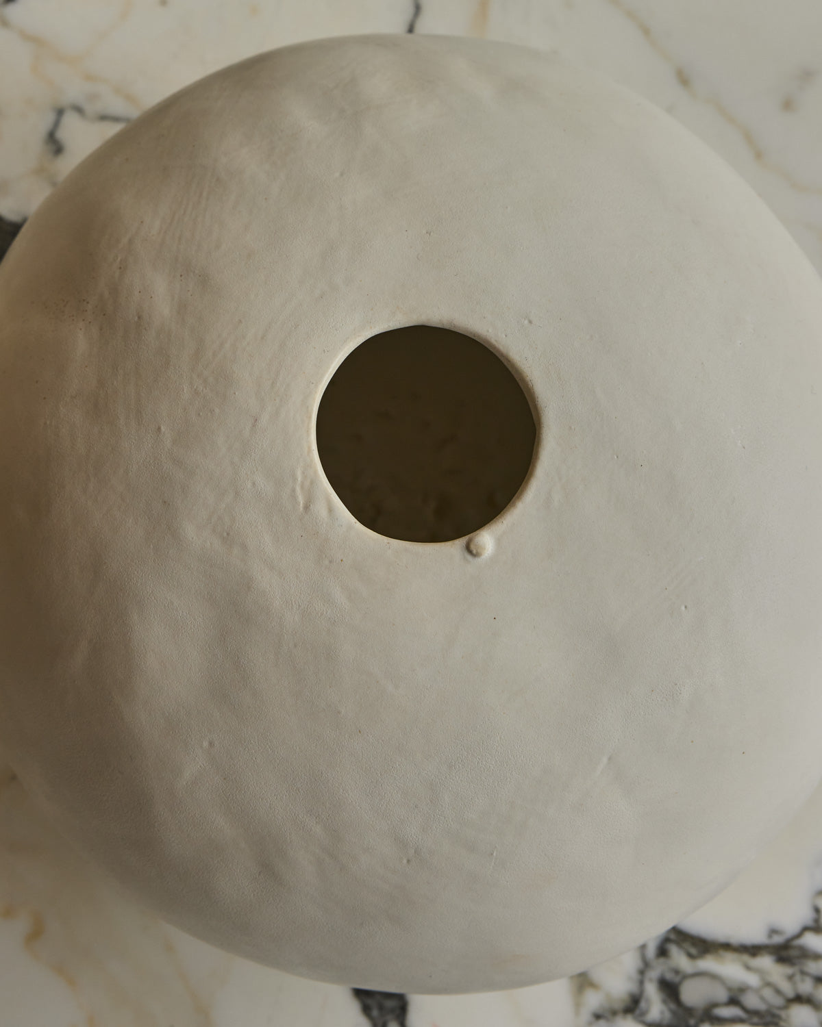These vessels are part of an ongoing series of rounded forms. They are hand built and blown into to achieve a certain volume. I liken the sizes to parts of the human form. The large and medium are glazed in a satin white glaze and the small is a white gloss.