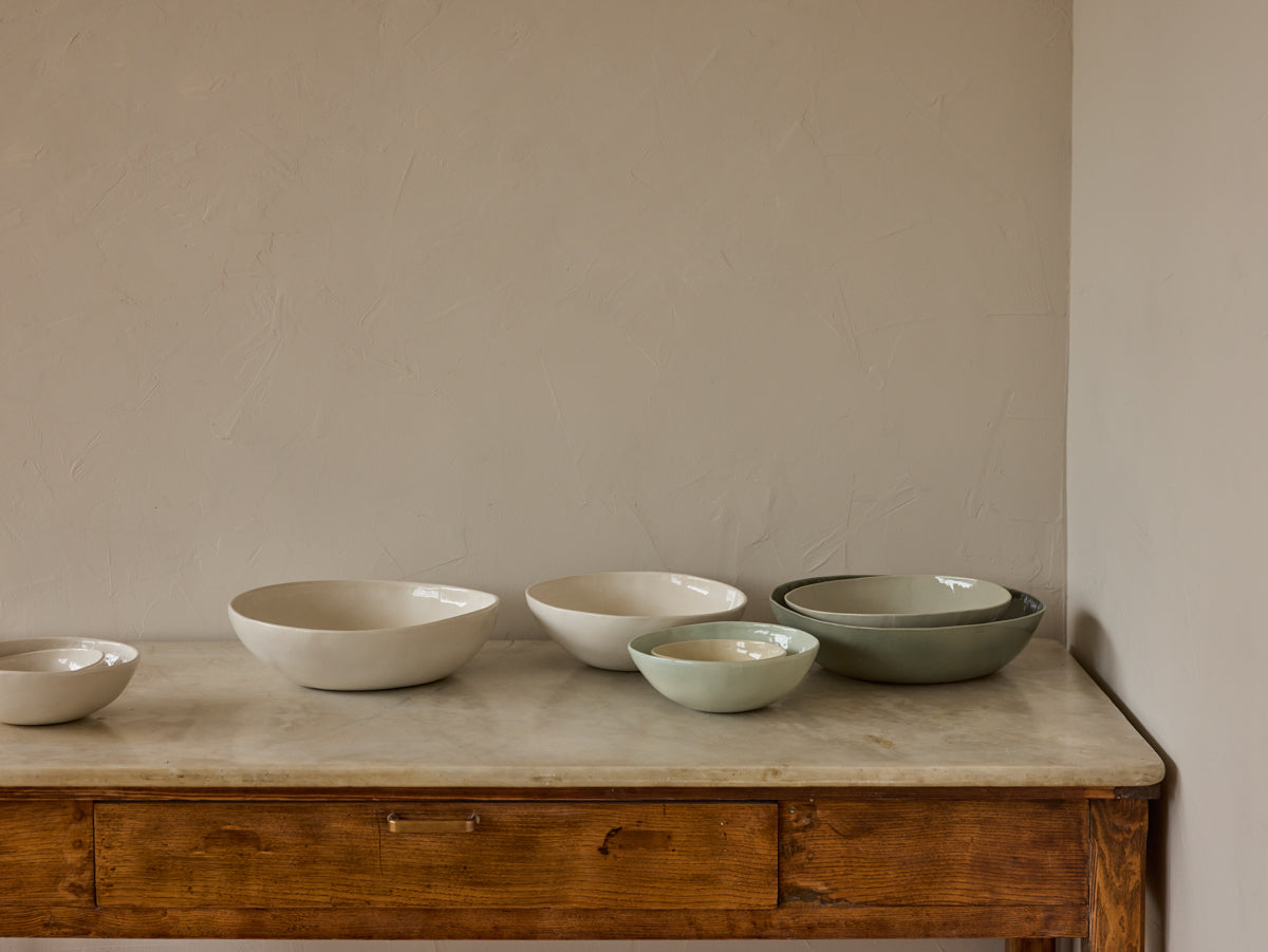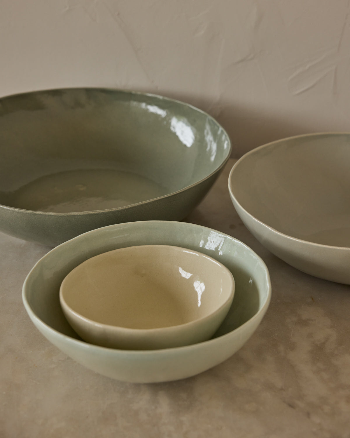 Set of four hand-built ceramic nesting bowls. Each set will vary in shape and color as we enjoy the wavy profiles and hand application of glazes of each individual bowl. Glazed in a calming palette of watery blue/green tones: Pond, Fog, Dew, and Mist.