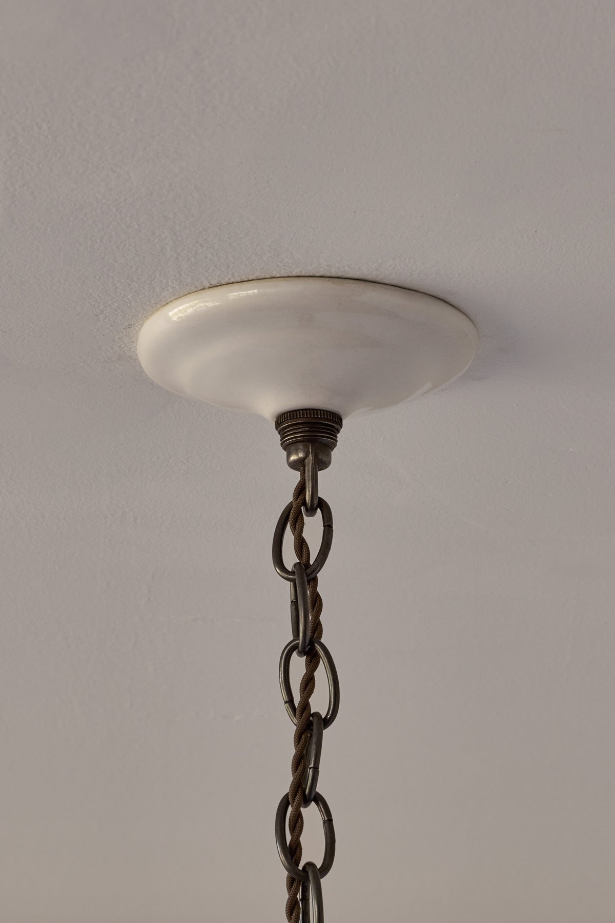 Hand-made in ceramic and brass, this canopy is made in compendium with the Natalie Page Funnel Light Collection. The ceramic base will cover any standard electric box while the ring is made to hang the chain. This canopy was made to hang a single pendant and can be used on a sloped ceiling.