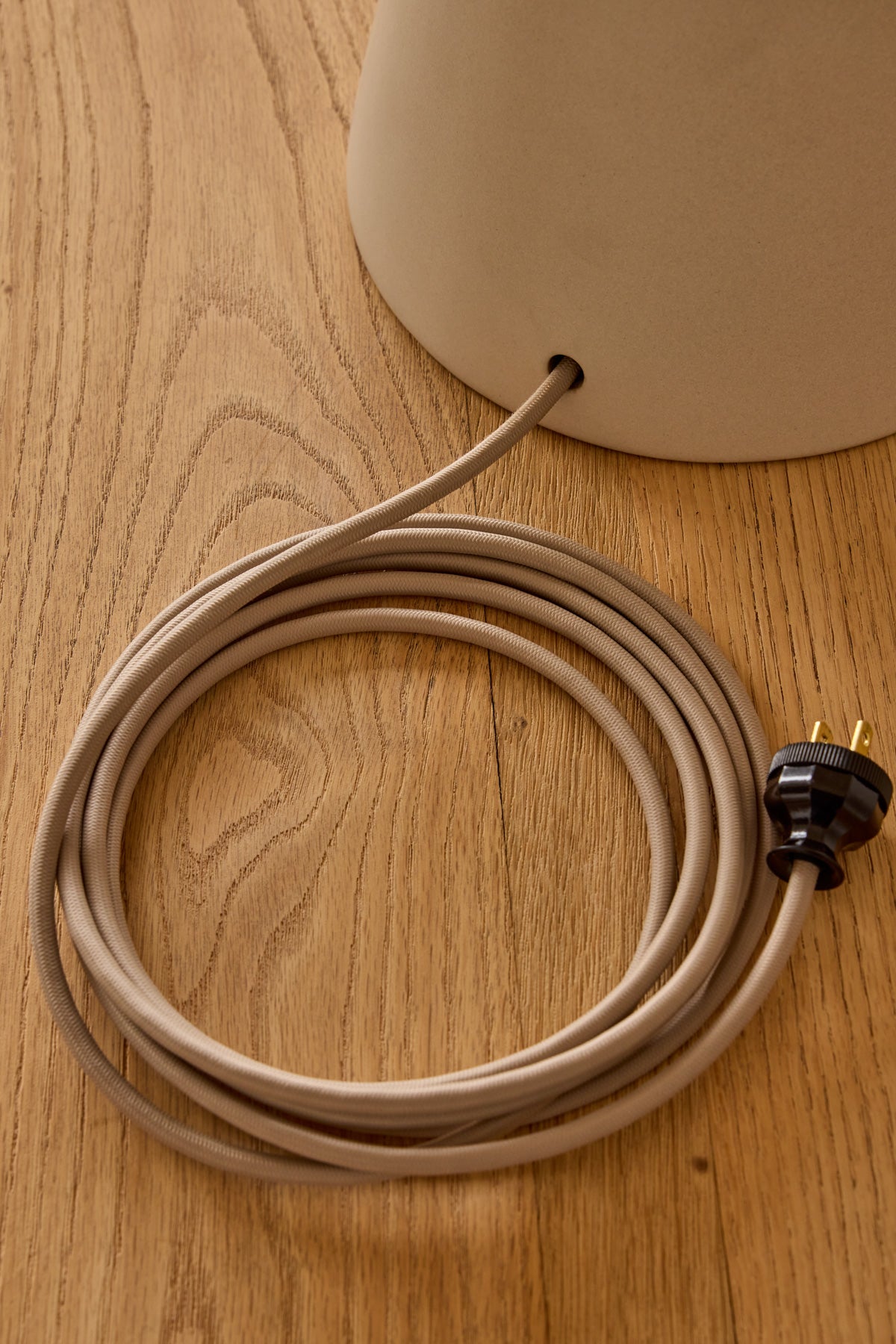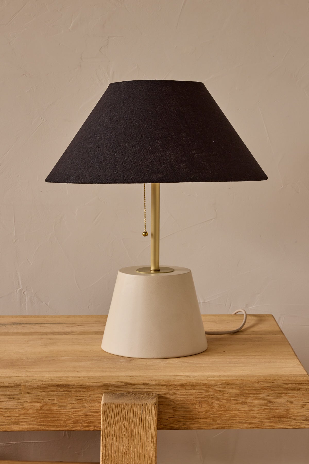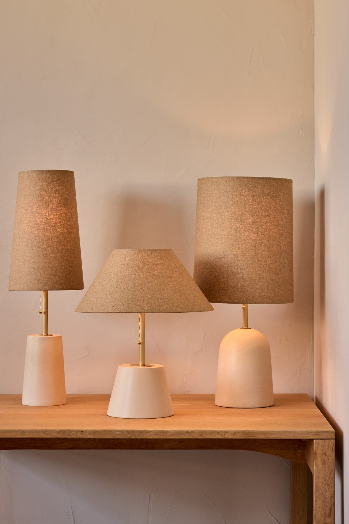 NOA: The subtle finish variations of the ceramic base paired with the natural texture of the linen fabric shades and gently shaped brass details come together to tell a timeless story both organic and refined. The Noa features a tapered flax or black linen shade which includes a removable matching diffuser for added elegance and a simple beige cloth cord.