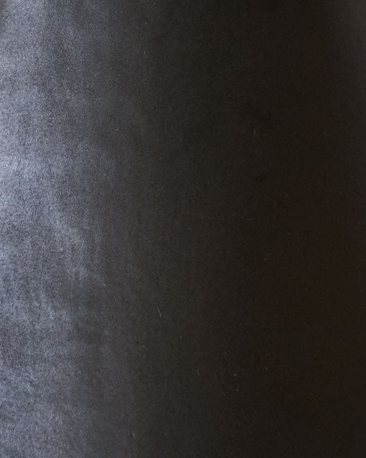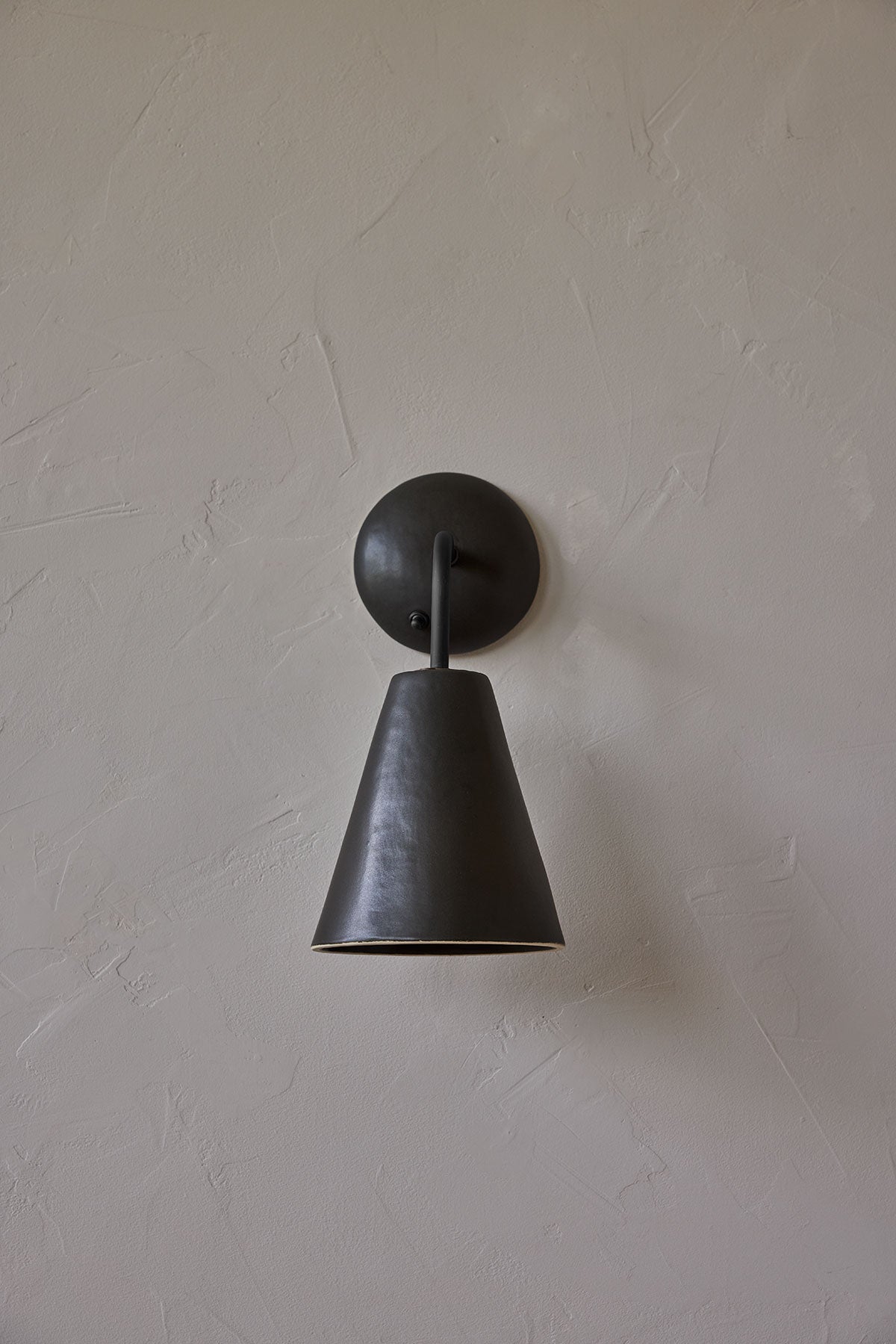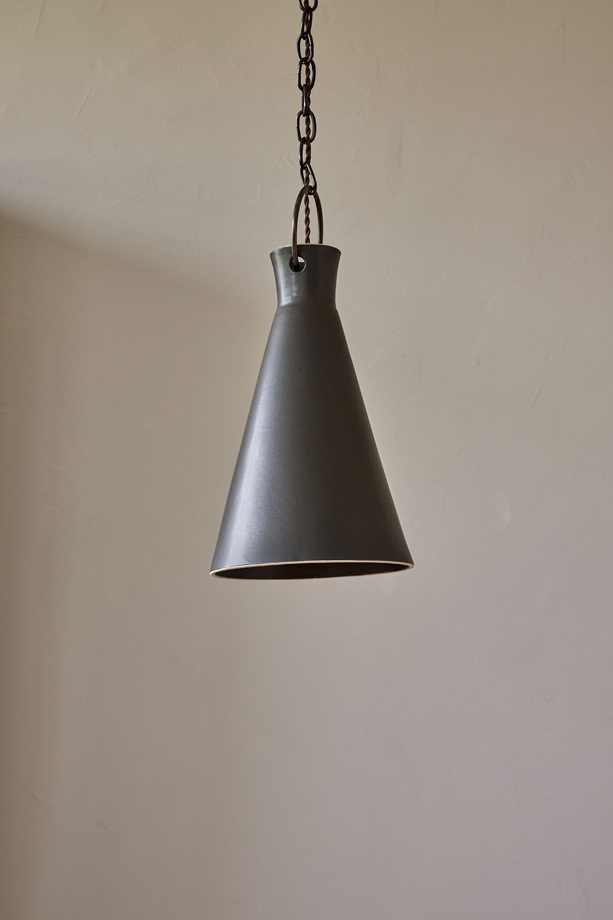 The Pepper colorway is a semi-matte black glaze with a hint of brown over the white stoneware clay. The Pepper funnel is glazed on the inside and outside of the form with a reveal of the unglazed stoneware clay at the rim on the bottom of the form and at the top. The contrast is high between the two colors.
