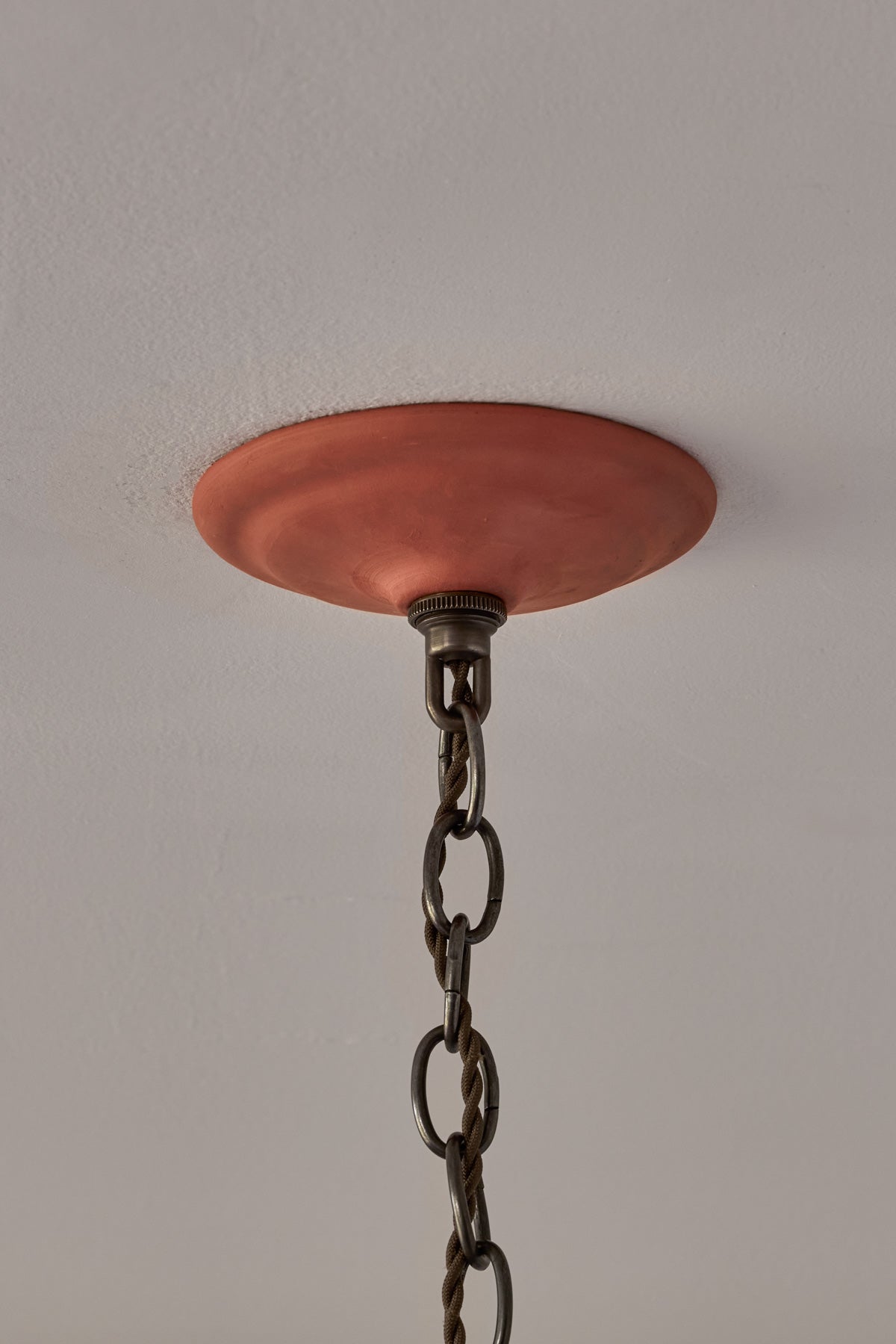 Hand-made in ceramic and brass, this canopy is made in compendium with the Natalie Page Funnel Light Collection. The ceramic base will cover any standard electric box while the ring is made to hang the chain. This canopy was made to hang a single pendant and can be used on a sloped ceiling.