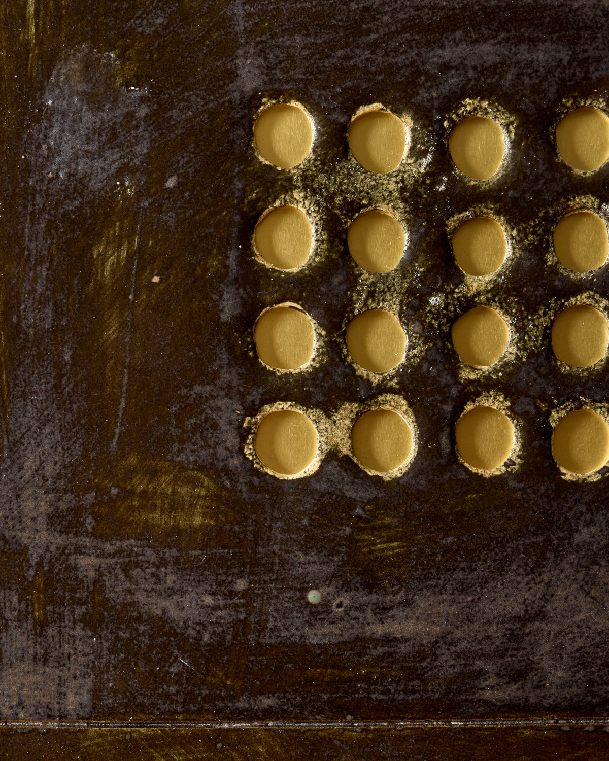 Abstract Grid Twenty reminds me of a city grate. It is a ceramic wall art piece inspired by the simplicity of circles and lines. The uneven black and deep green surface provides a strong foreground for the contrast of the brass surface coming through to form the grid of twenty centered circles. The brass will age and darken over time going from gold to a slightly darker version of itself as it would if it lived on a city street.