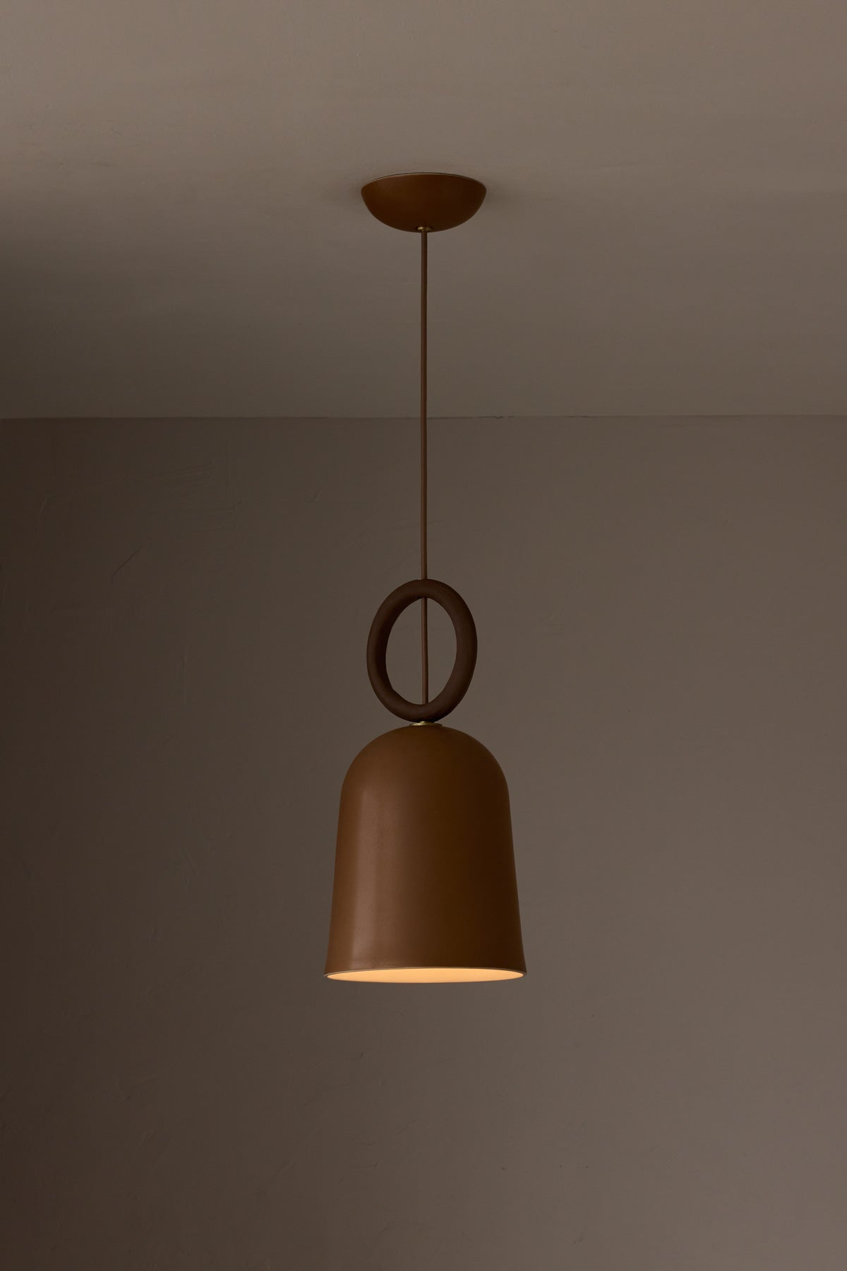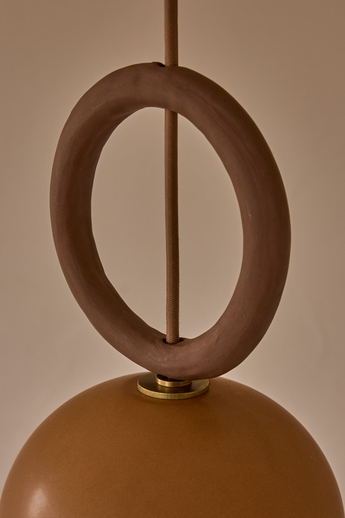 WILLA: Refined shades and hand-built loops create forms that captivate and shift with perspective. Subtle finish variations within the pendants combined with unglazed loops capture a tonal effect both sculptural and organic. The hazelnut cloth cord and simple chestnut ceramic canopy showcase the distinctive character of each pendant.