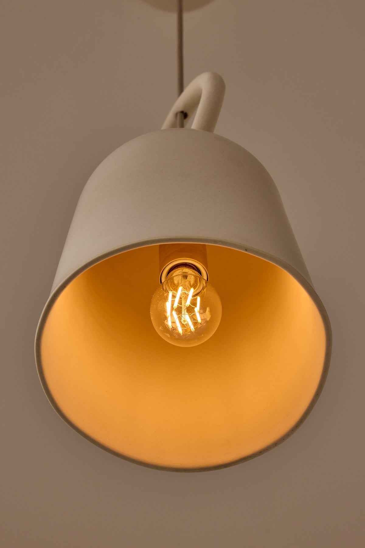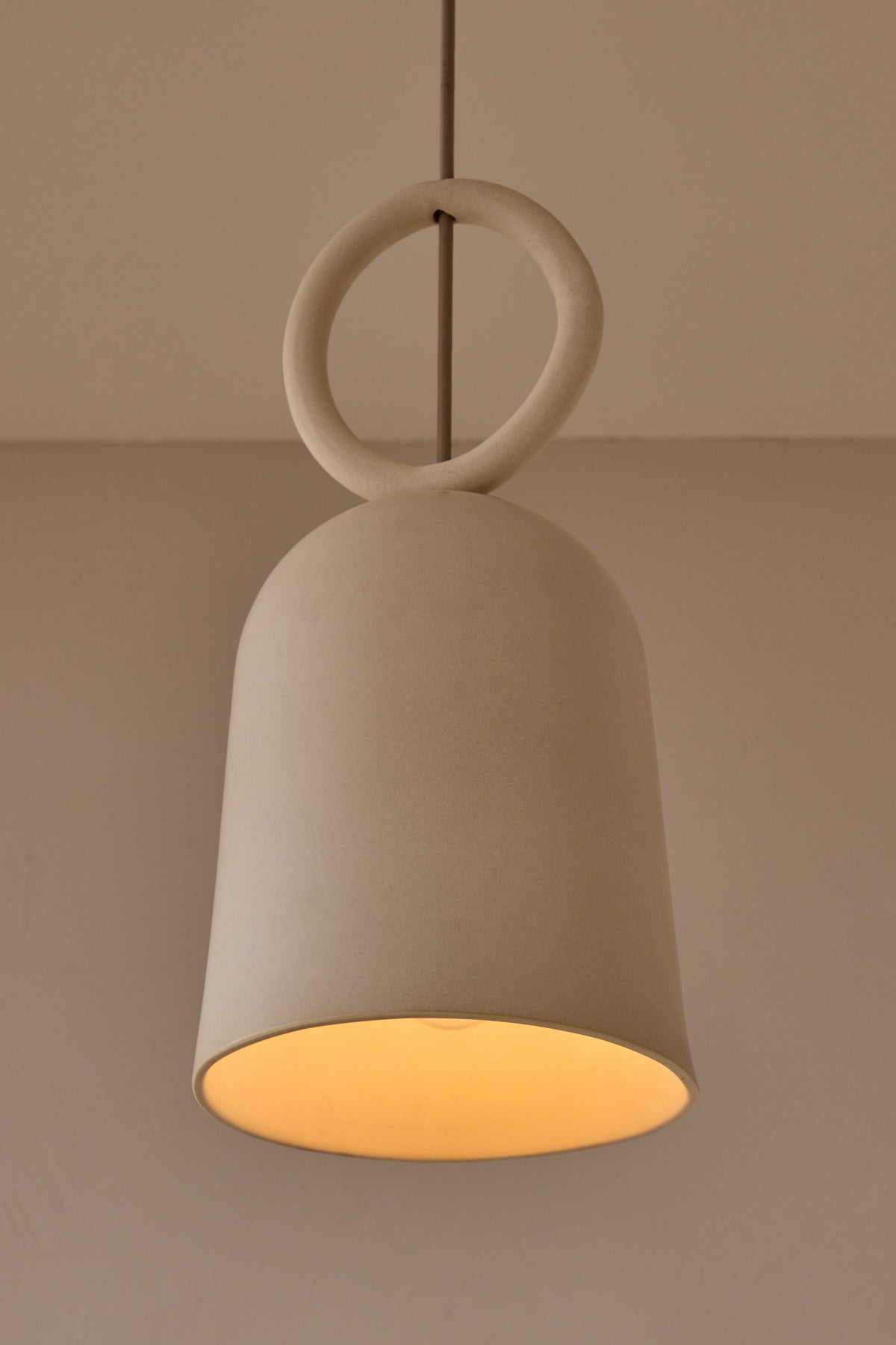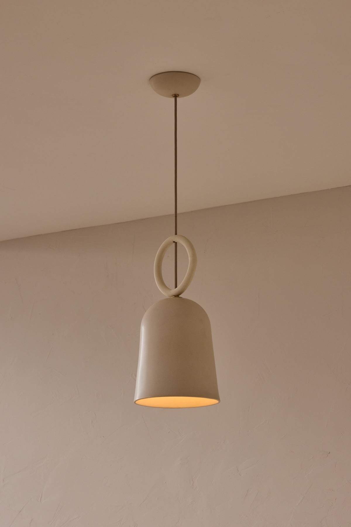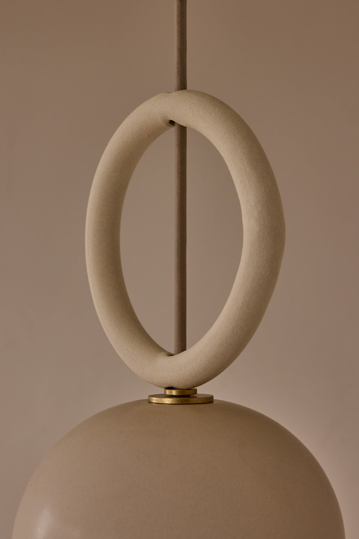 WILLA: Refined shades and hand-built loops create forms that captivate and shift with perspective. Subtle finish variations within the pendants combined with unglazed loops capture a tonal effect both sculptural and organic. The beige cloth cord and simple dogwood ceramic canopy showcase the distinctive character of each pendant.