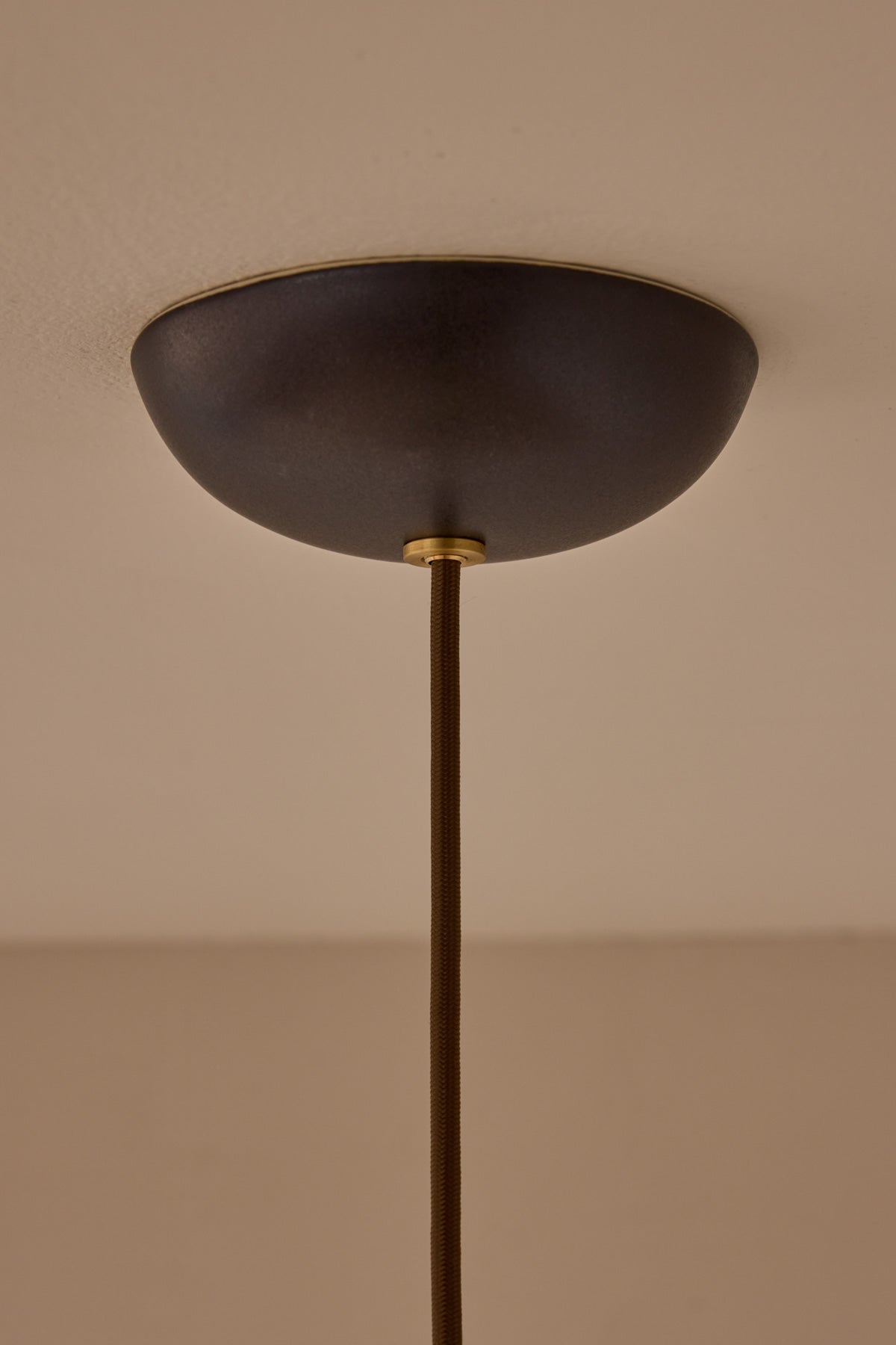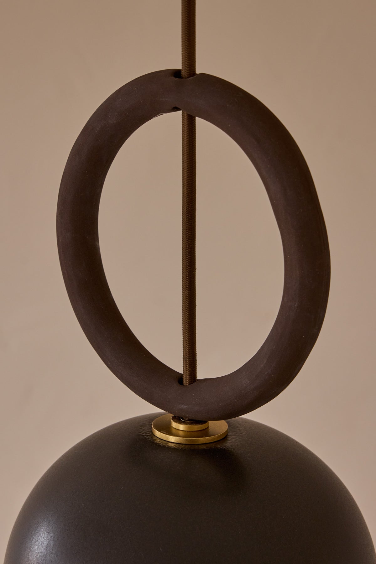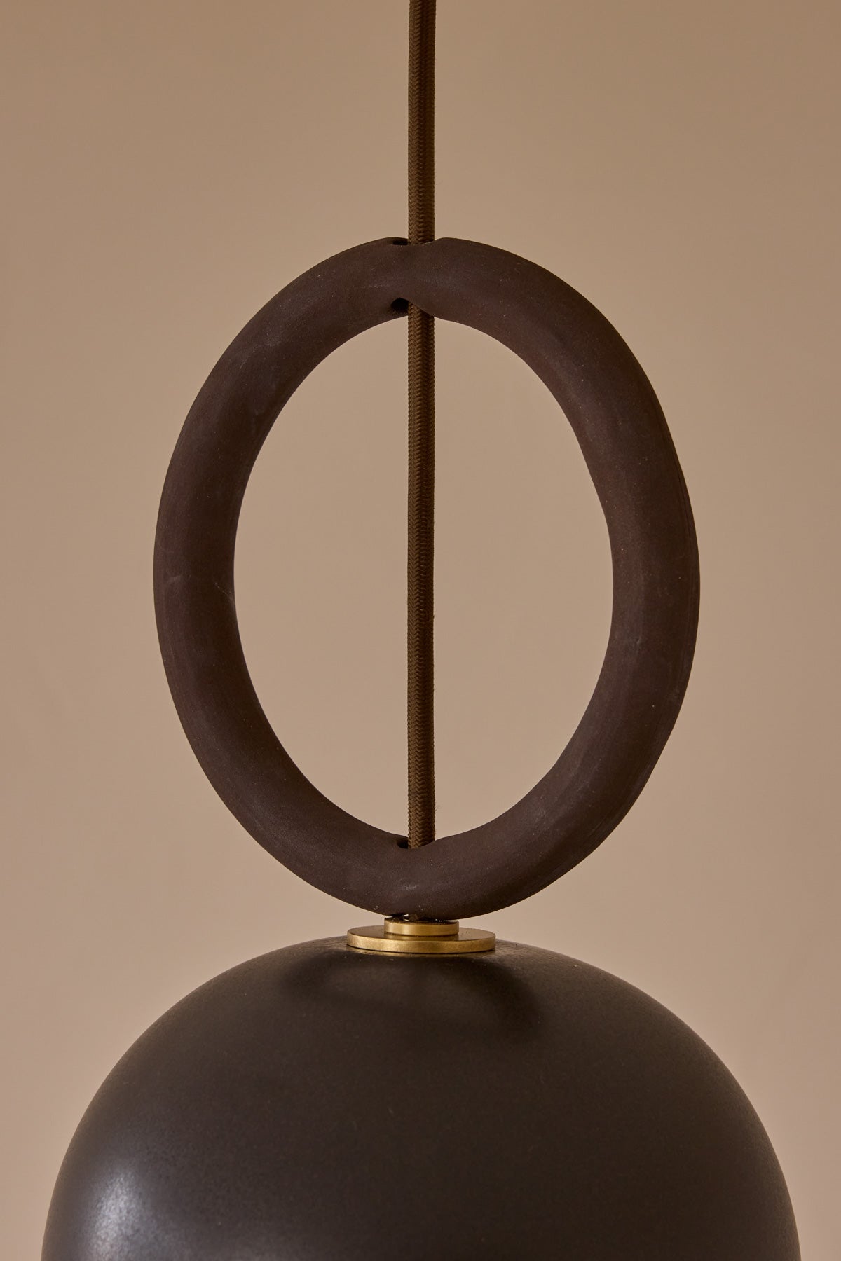 WILLA: Refined shades and hand-built loops create forms that captivate and shift with perspective. Subtle finish variations within the pendants combined with unglazed loops capture a tonal effect both sculptural and organic. The dark brown cloth cord and simple ebony ceramic canopy showcase the distinctive character of each pendant.