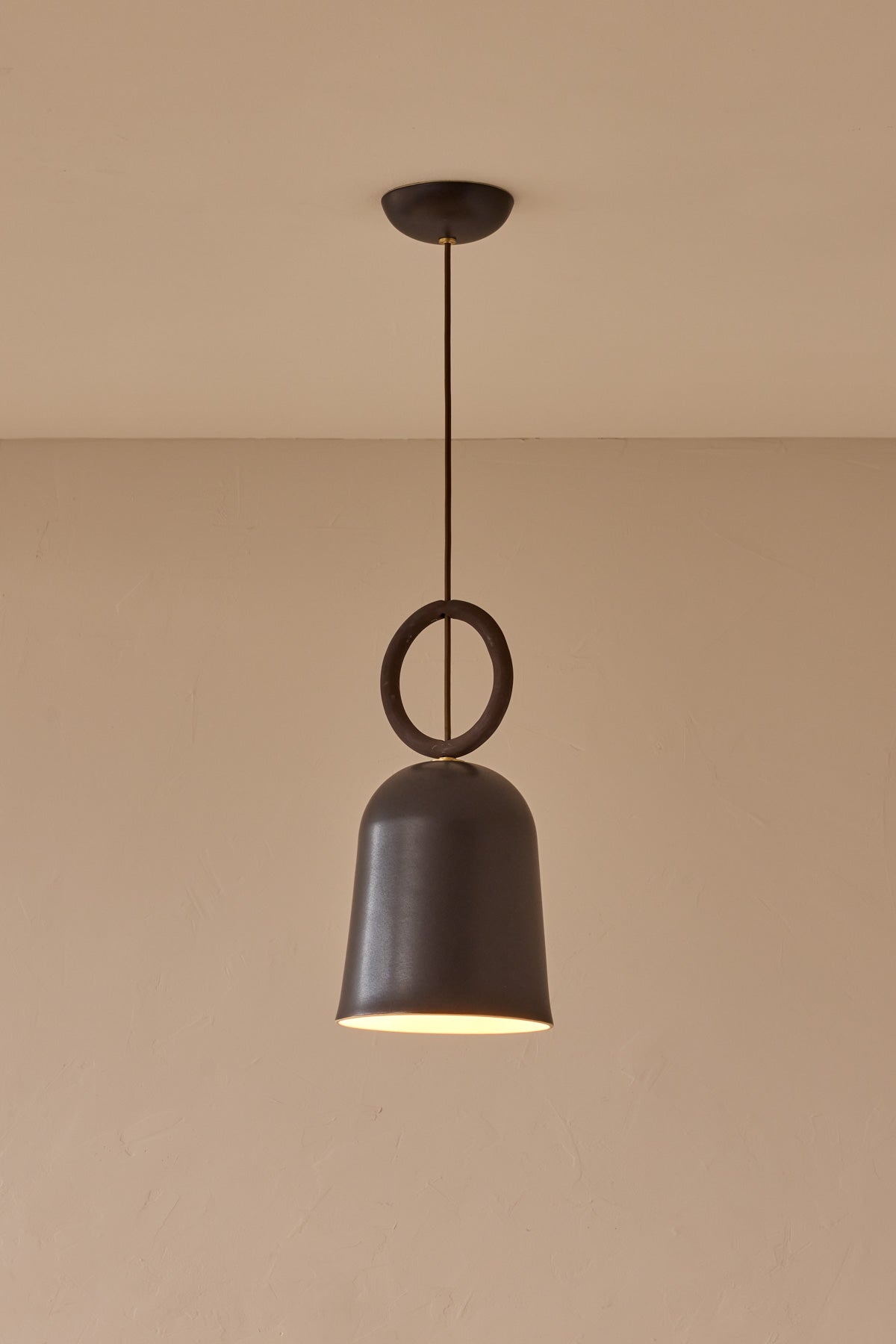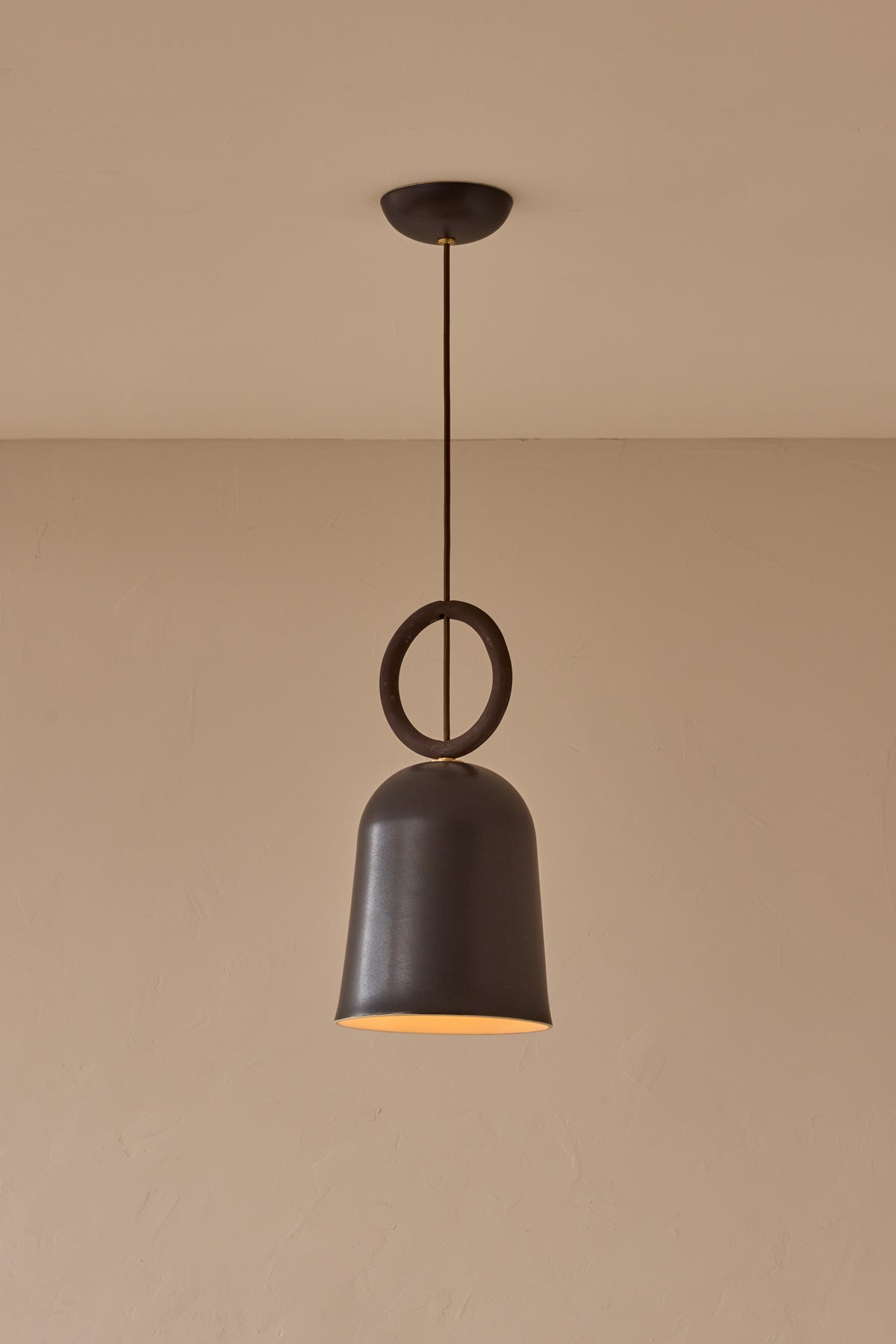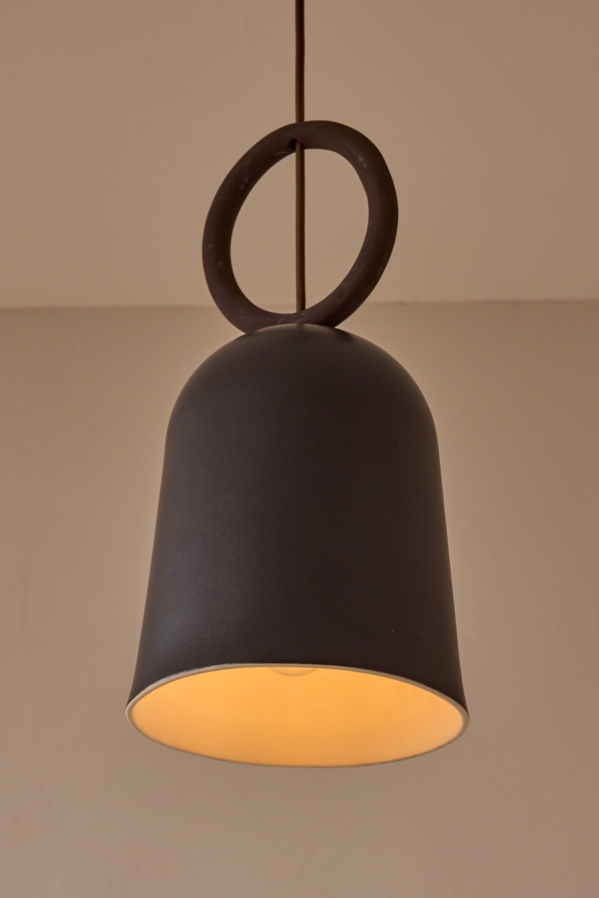 WILLA: Refined shades and hand-built loops create forms that captivate and shift with perspective. Subtle finish variations within the pendants combined with unglazed loops capture a tonal effect both sculptural and organic. The dark brown cloth cord and simple ebony ceramic canopy showcase the distinctive character of each pendant.
